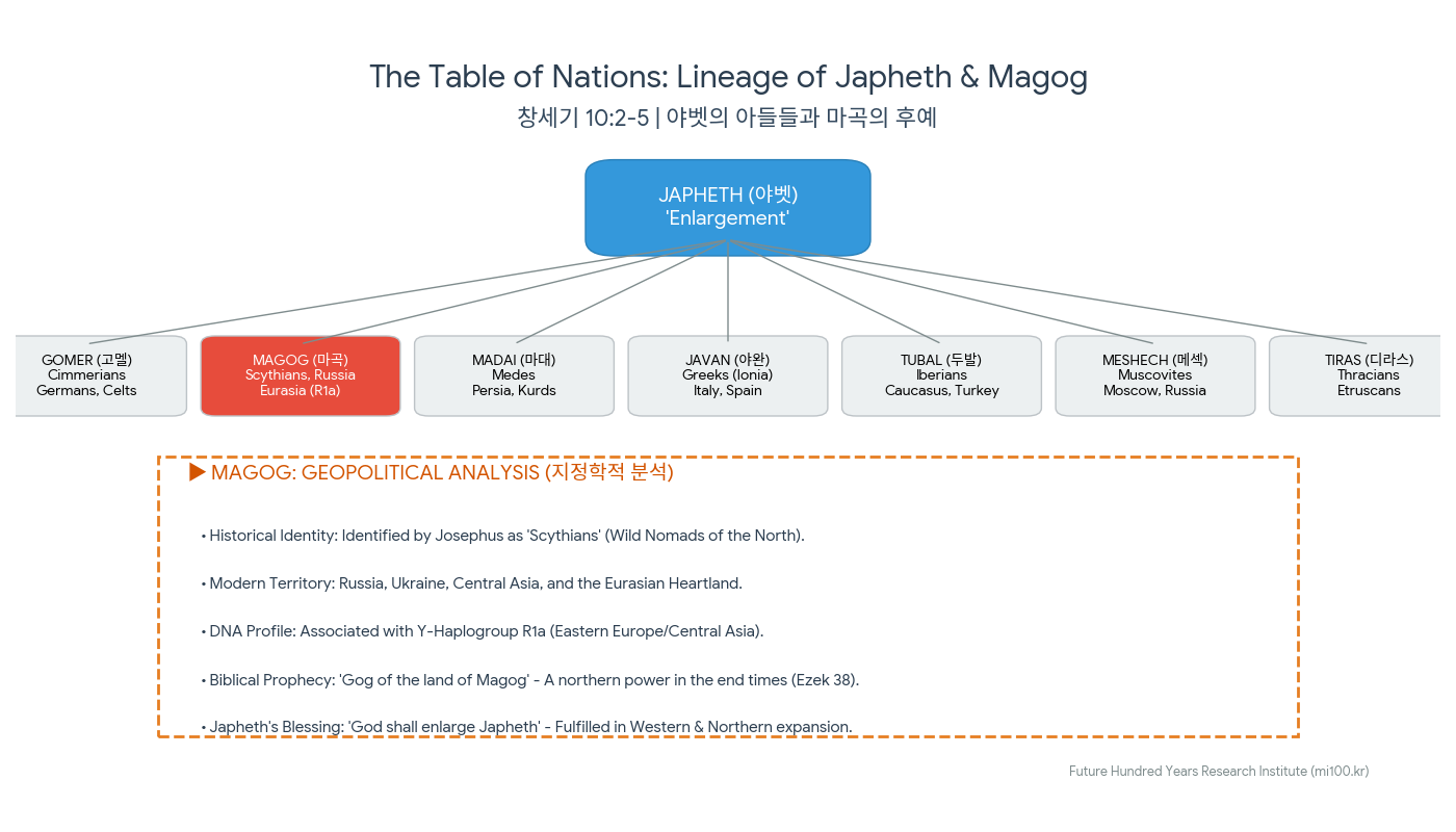 이 자료는 ‘미래백년연구소(mi100.kr)’에서 추진하는 지정학 및 국가 전략 연구의 기초 자료로서 인류학적·지리학적 데이터를 통합하여 구성했습니다. 야벳과 마곡의 후손: 서구 및 유라시아 인종의 기원 가로형(A4 Landscape) 비율로 제작된 이 인포그래픽은 야벳의…