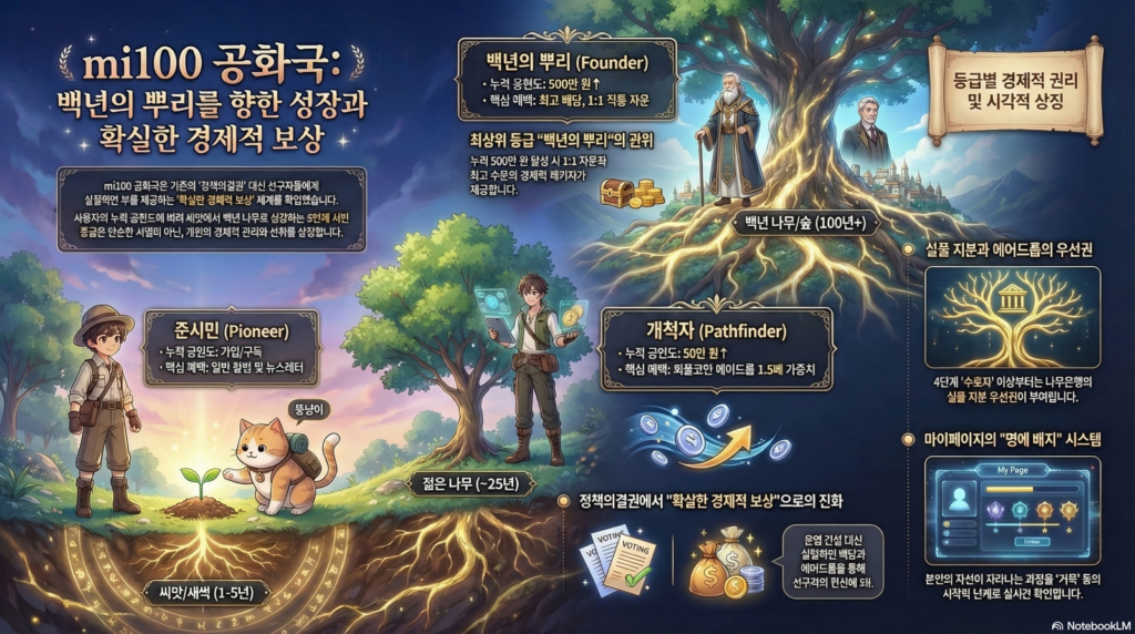 mi100공화국은 선구자 여러분의 기여를 헛되이 소모하지 않습니다. 여러분이 내는 멤버십 피와 후원금은 공화국의 연료인 동시에, 여러분의 계좌에 쌓이는 ‘나무 포인트’가 됩니다. 이는 향후 발행될 더피코인(The People Coin)과 100년 나무은행의 실물 수익권으로 환환되는 ‘자산형 멤버십‘의 출발점입니다.