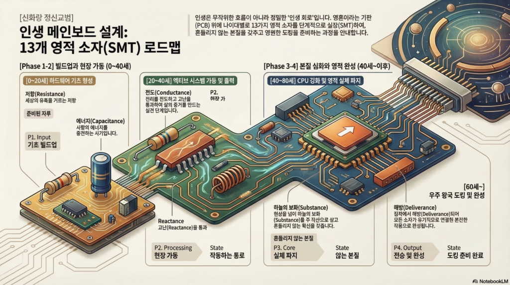이 원고는 단순한 텍스트를 넘어, 우리 영혼이라는 기판(PCB) 위에 13개의 소자를 단계적으로 실장(SMT)해 나가는 ‘인생 회로 설계도‘입니다. 신화랑들의 필독서가 될 수 있도록 시각적 구조를 갖춘 인포그래픽형 원고로 정리하였습니다.