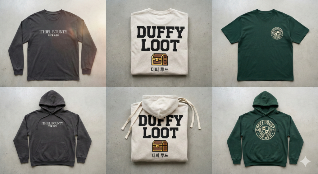 - 소장님 말씀처럼 보그(Vogue) 스타일의 폰트를 입힌 티셔츠나 굿즈를 만듭니다. MZ는 “Ithiel: Presence of the Divine” 같은 문구가 새겨진 미니멀한 블랙 후드티에 열광할 것입니다.