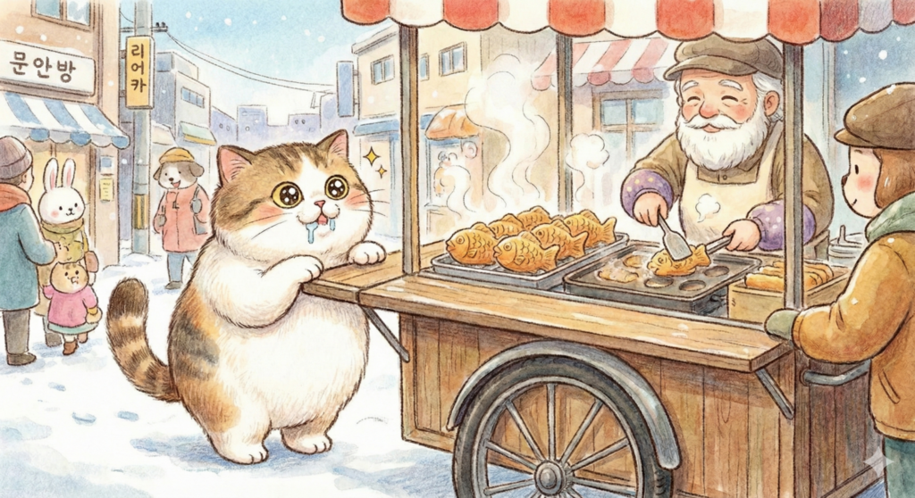 뚱냥이: (코를 킁킁거리며) 야옹~ 아저씨! 이 붕어빵 냄새는 정말 참기 힘들어요. 그런데 아저씨, 왜 저 말랑말랑한 밀가루 반죽을 저 뜨겁고 무서운 쇠틀 속에 가두는 거예요? 그냥 구우면 안 돼요?